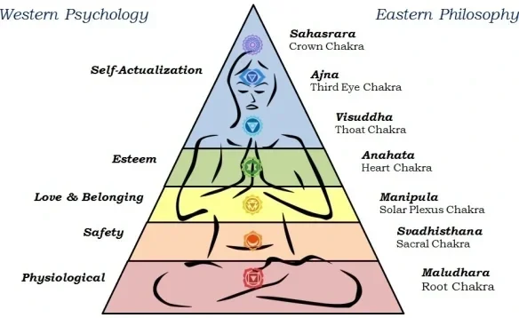 Maslow’s hierarchy of needs (left) and the chakra system (right) come from different traditions—Western psychology and Eastern philosophy—but both suggest the importance of meeting certain foundational needs before higher levels of expression, connection, or insight can emerge. While not a one-to-one match, I find the parallels interesting (read more here or here).